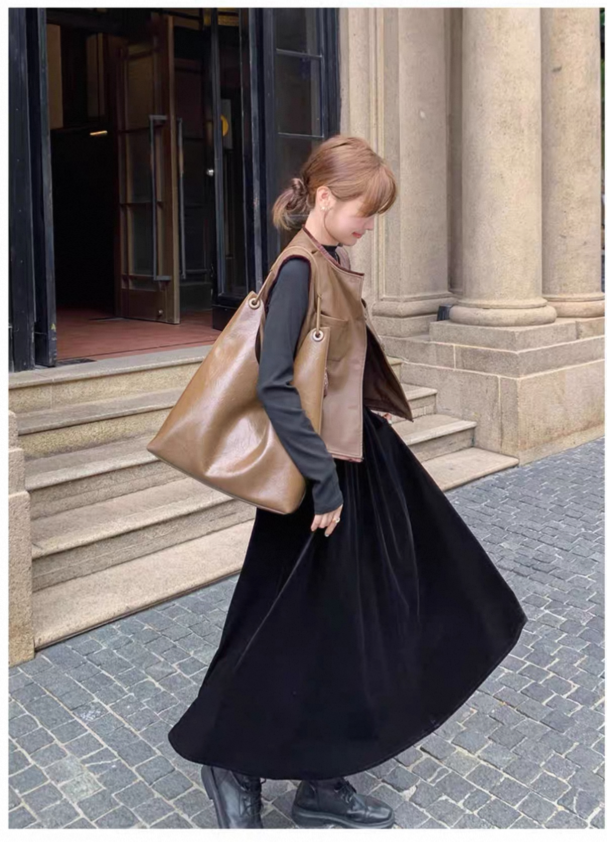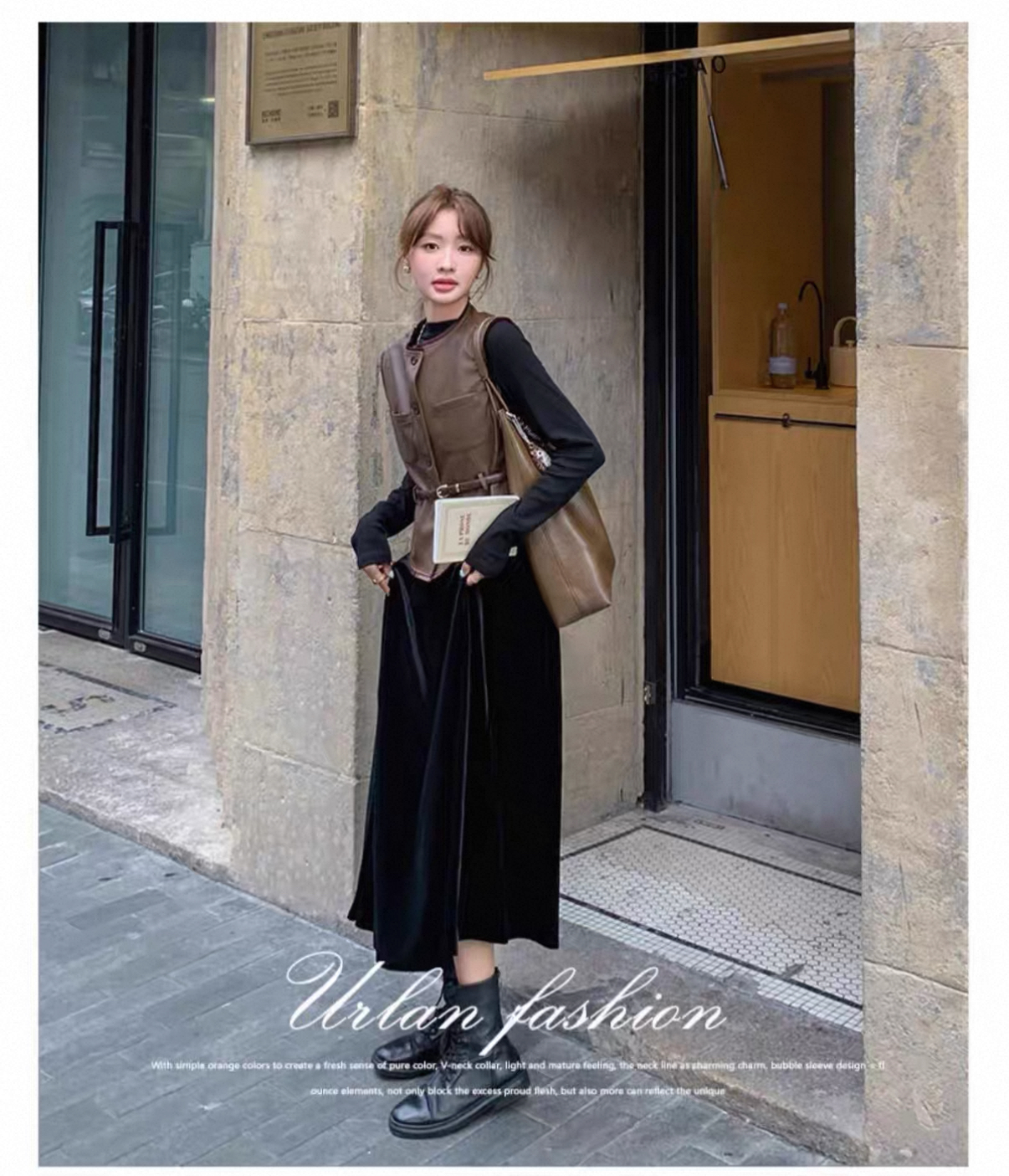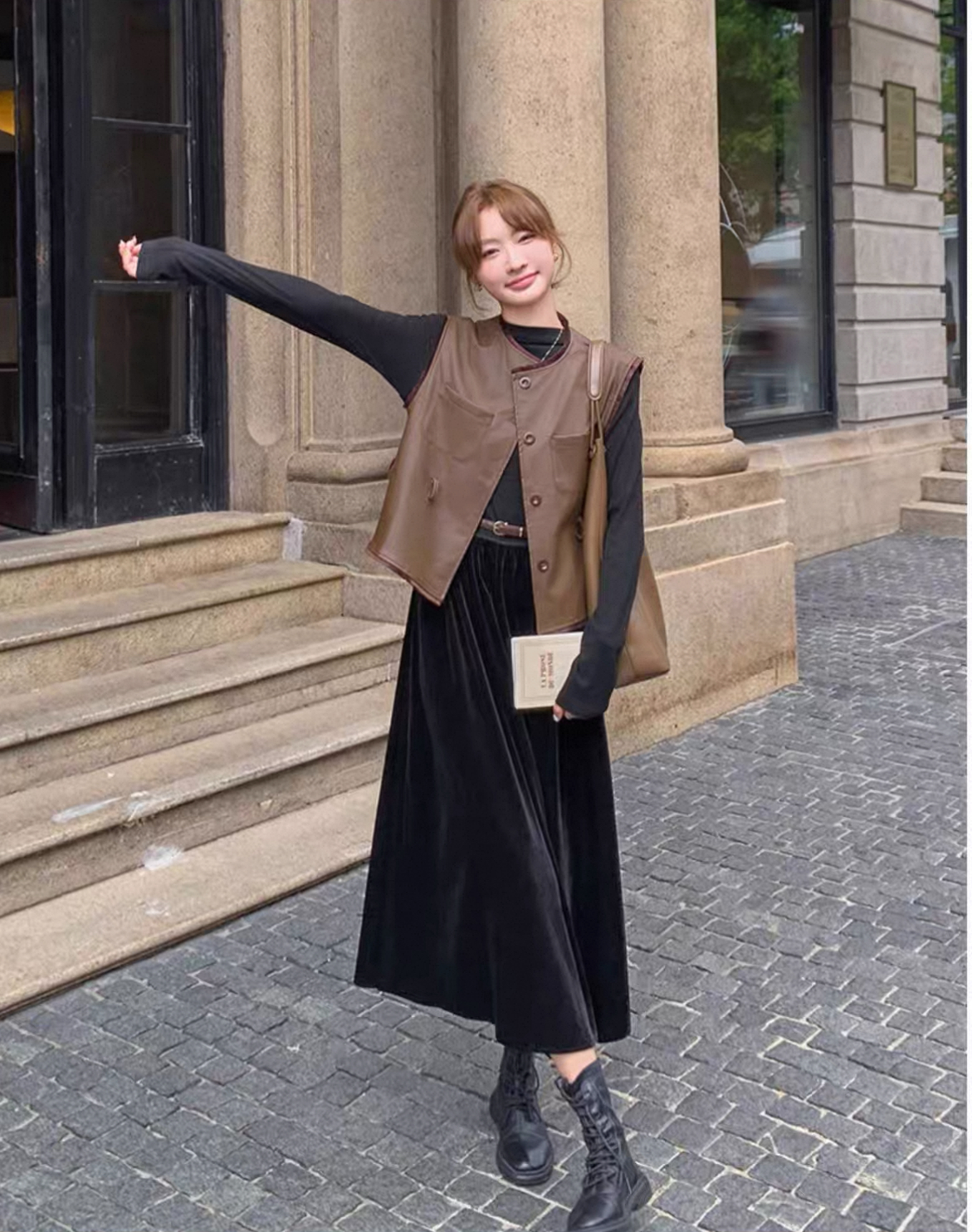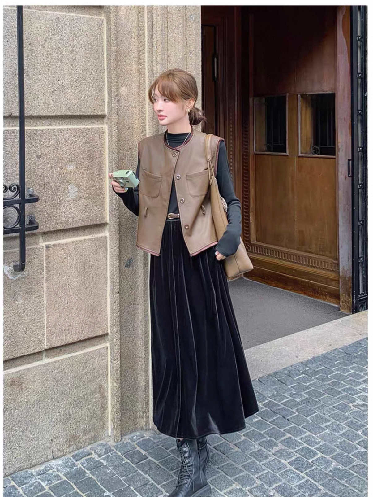秋冬氣質套裝 絲絨拼接連衣裙+皮革馬甲|氣質穿搭 顯瘦遮肉
