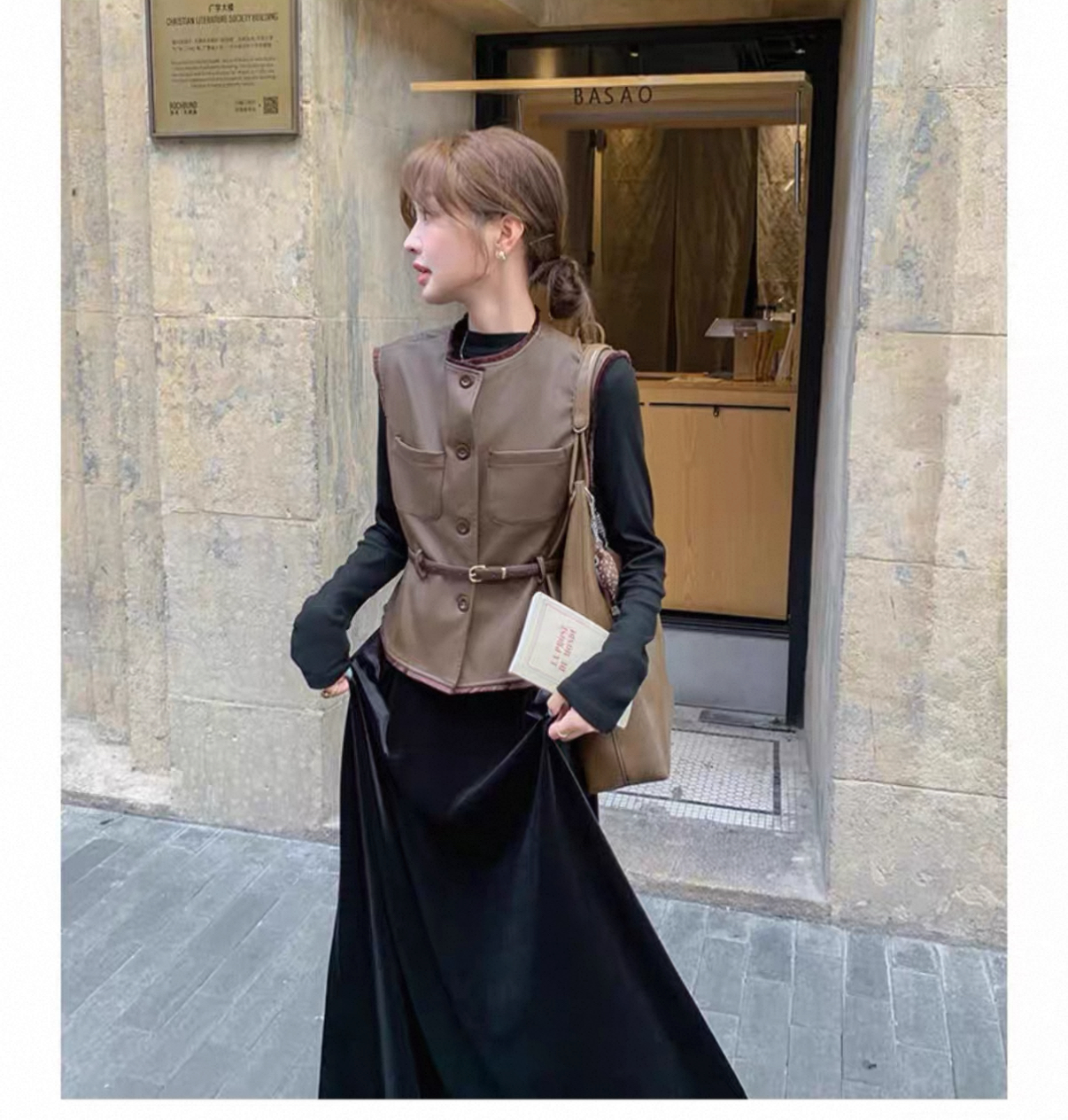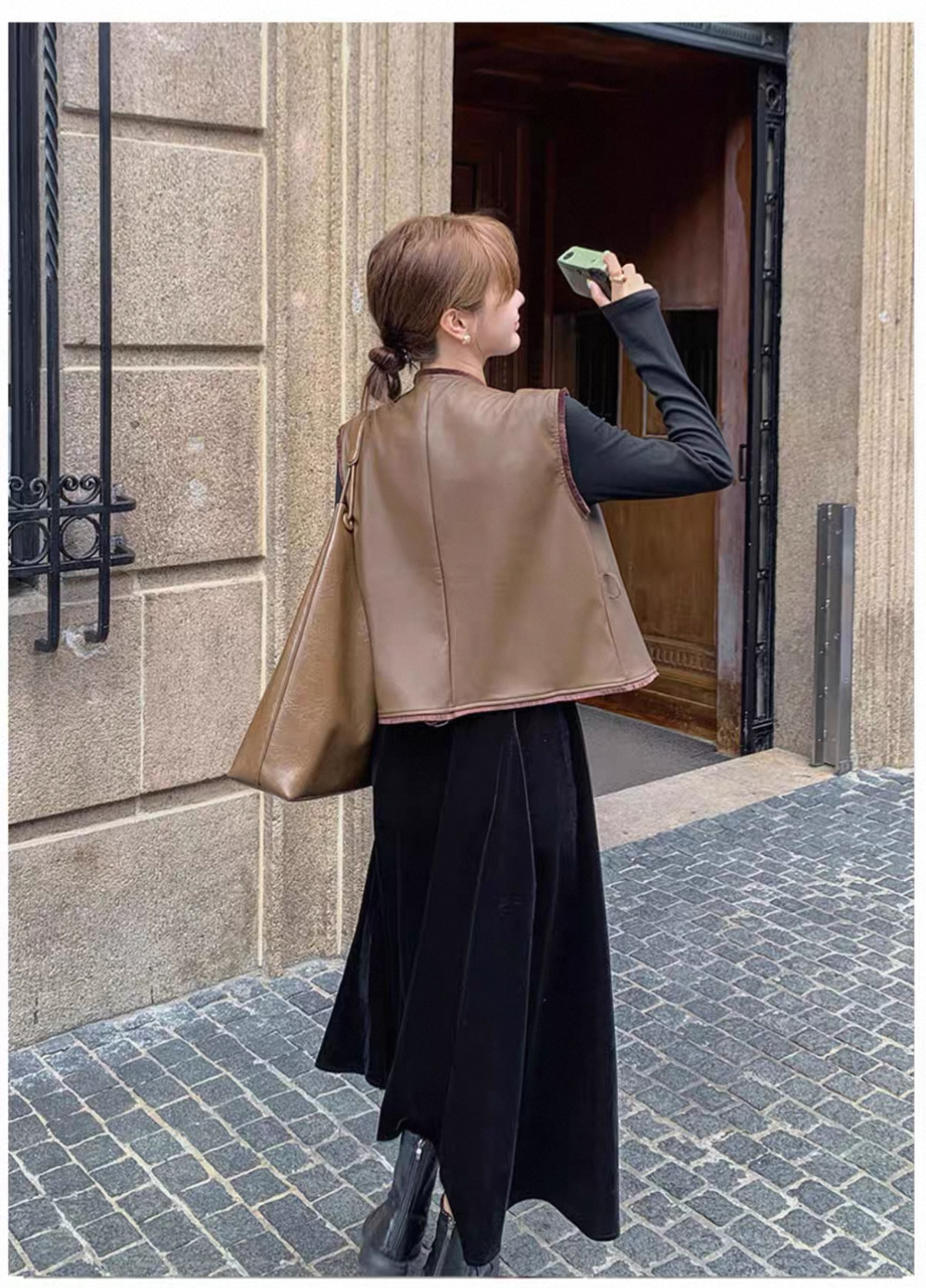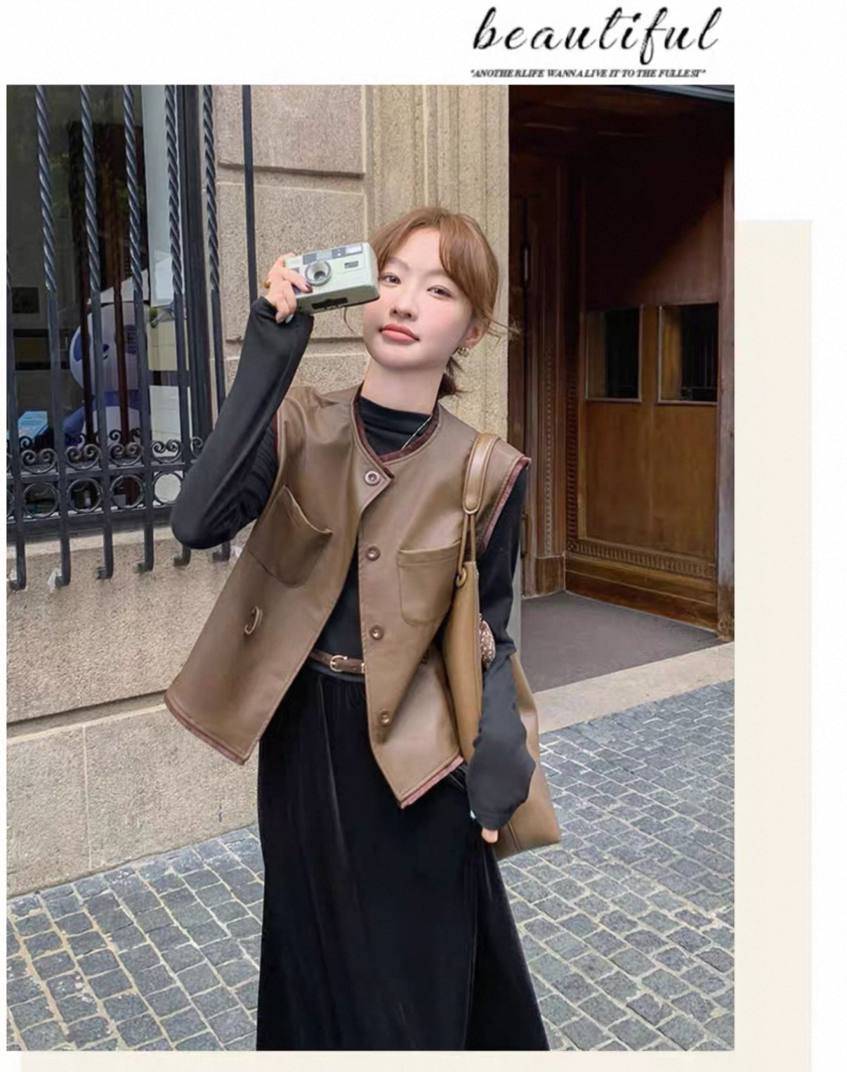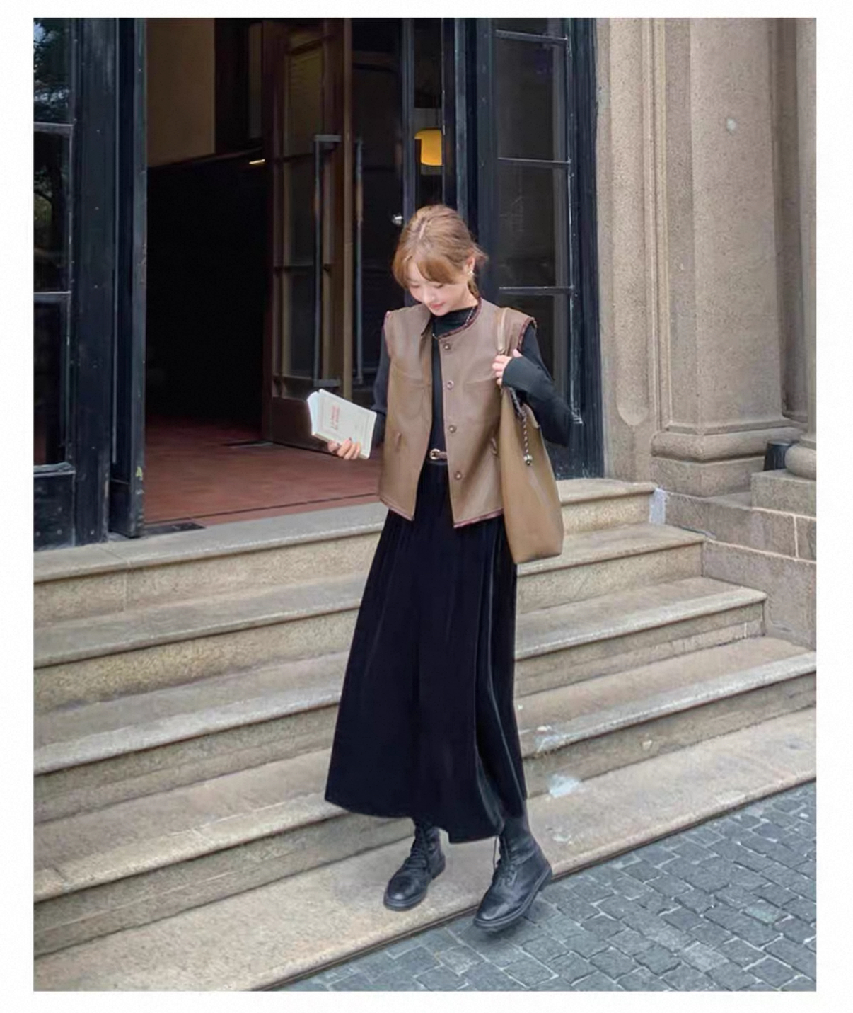秋冬氣質套裝 絲絨拼接連衣裙+皮革馬甲|氣質穿搭 顯瘦遮肉