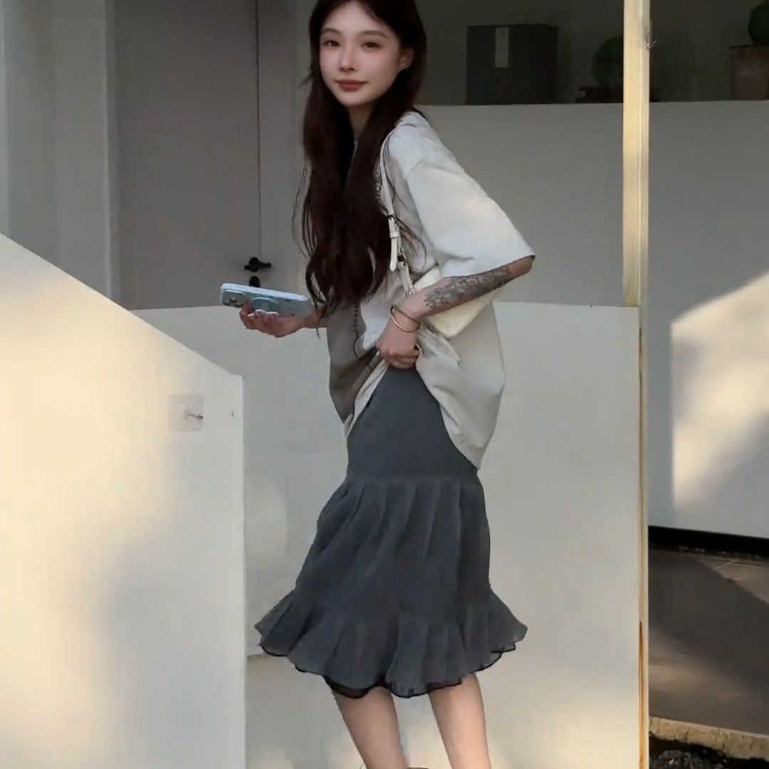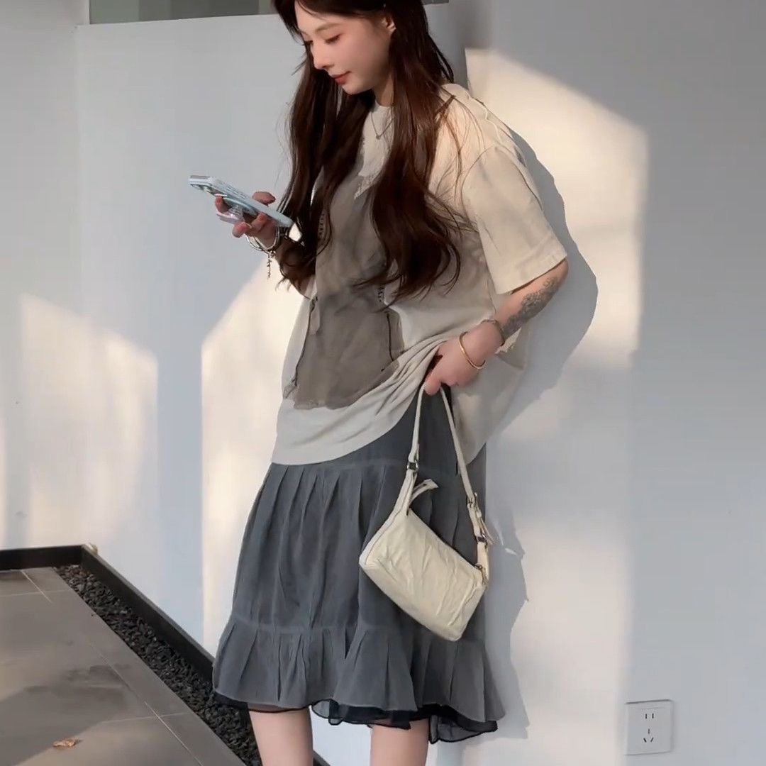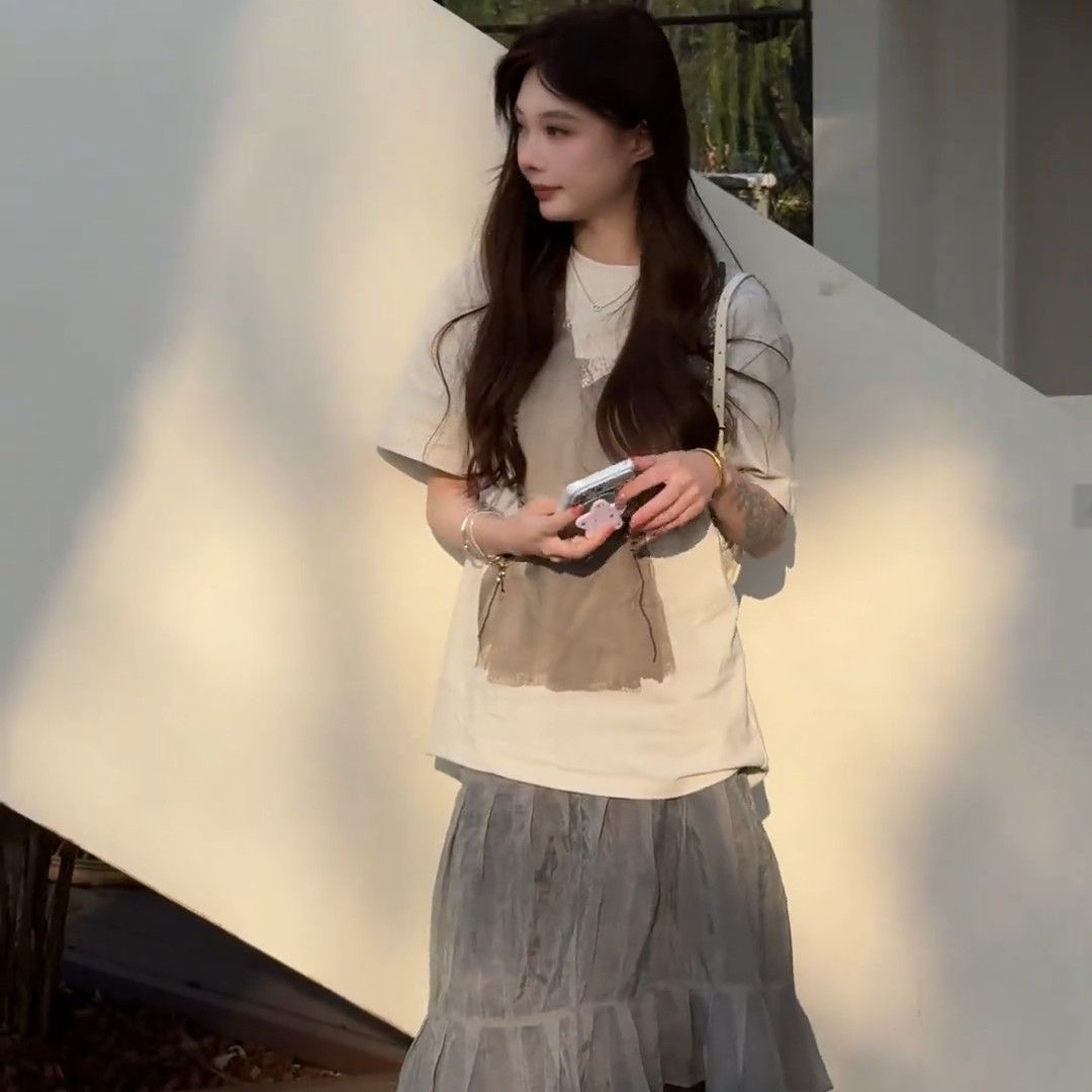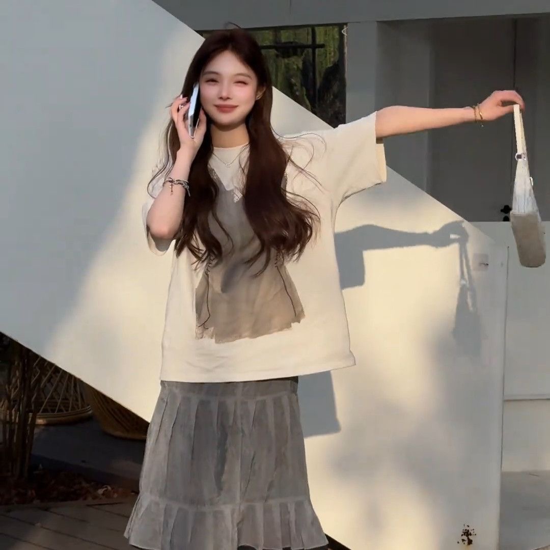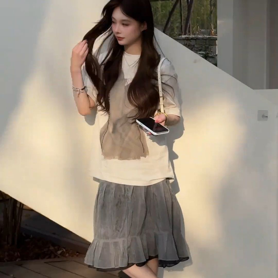 日系 初夏套裝 印花T恤+高腰半身裙|知性美 寬鬆顯瘦